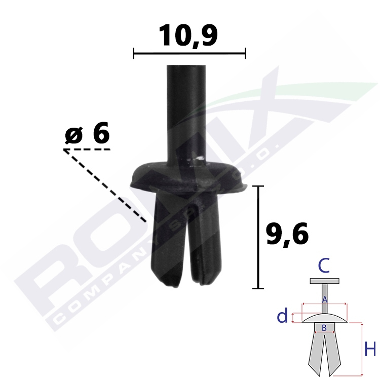 A 10,9 B 6 C 3,9 d 2 H 9,6 w otwór ø 6