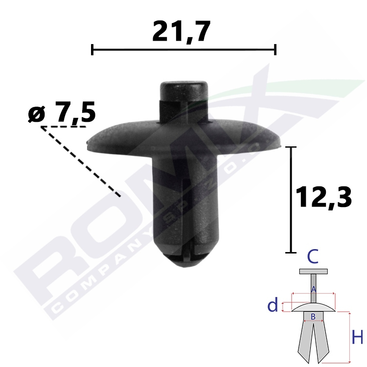 A 21,7 B 7,4 C 5,5 d 2,7 H 12,3 w otwór ø 7,5