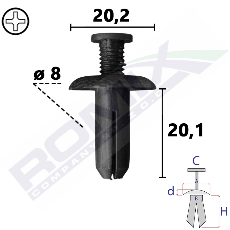 A 20,2 B 8 C 9,6 d 3 H 20,1 w otwór ø 8