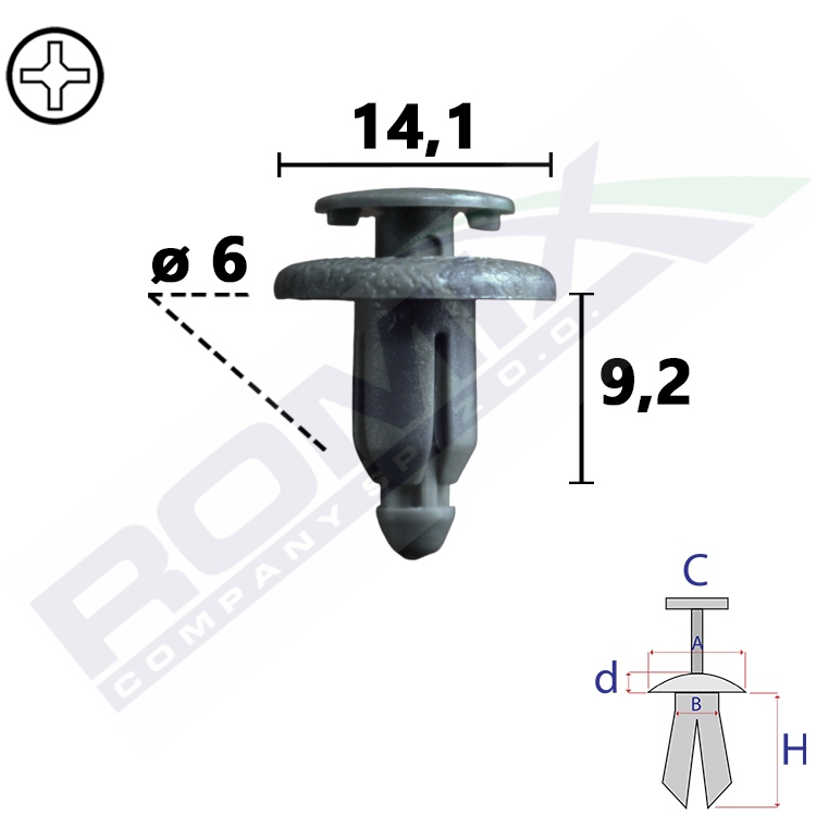Dimensions: A 14,1 B 6 C 9,9 d 2 H 9,2 w otwór ø 6