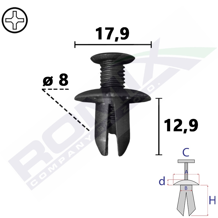 A 17,9 B 7,9 C 10,7 d 2,7 H 12,9 w otwór ø 8