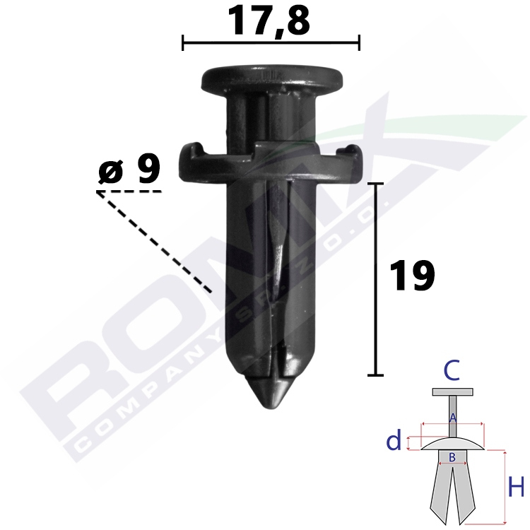 Dimensions: A 17,8 B 8,9 C 13,7 d 3 H 19 w otwór ø 9