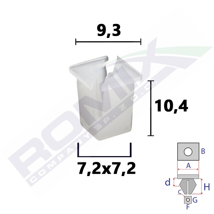 Dimensions: A 9,3 B 9,2 C 3 F 7,2 G 7,2 H 10,4