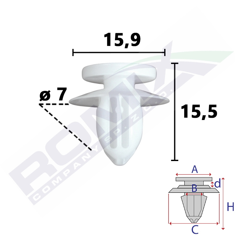 Dimensions: A 11,9 B 6,8 C 15,9 d 2,1 H 15,5 w otwór ø 7