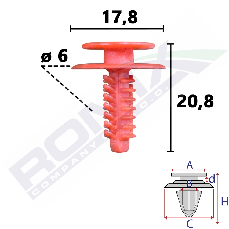 A 13,8 B 5,5 C 17,8 d 3,1 H 20,8 w otwór ø 6