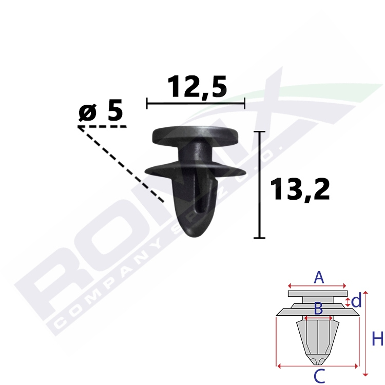 Dimensions: A 10,7 B 5 C 12,5 d 2,6 H 13,2 w otwór ø 5