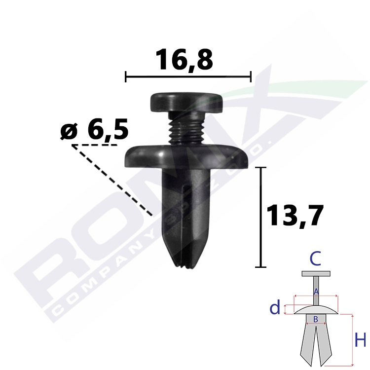 A 16,8 B 6,6 C 9,8 d 3,2 H 13,7 w otwór ø 6,5