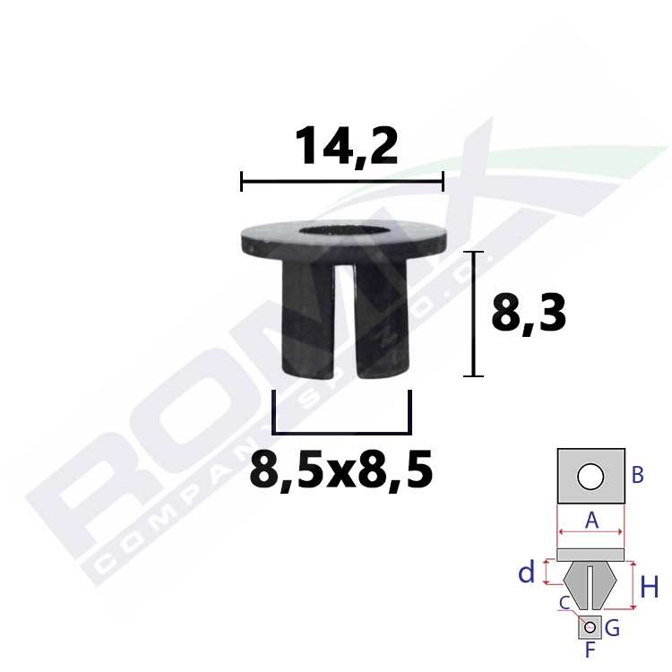 Wymiary: A 14,2 C 6,6 F 8,5 G 8,5 H 8,3 na wkręt 6,2