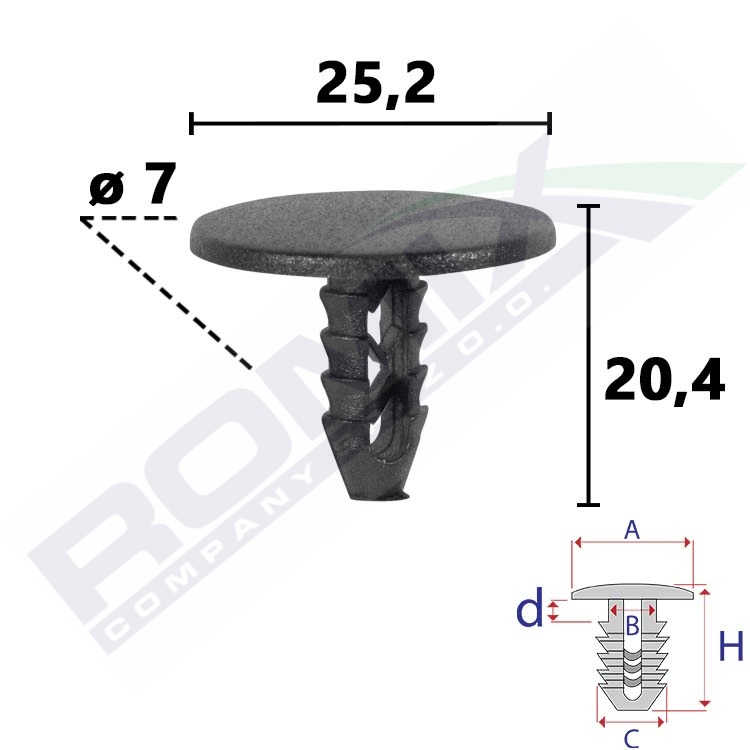 A 25,2 B 6,4 C 7,9 d 2,6 H 20,4 w otwór ø 7