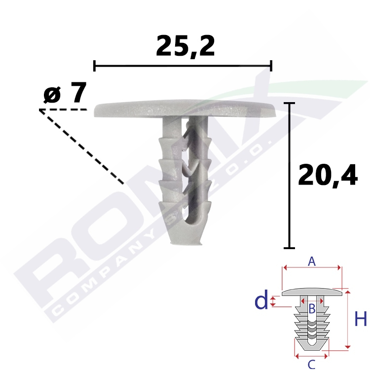 Wymiary: A 25,2 B 6,4 C 7,9 d 2,6 H 20,4 w otwór ø 7