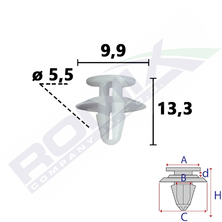 A 9,9 B 4,8 C 13,9 d 2,4 H 13,3 w otwór ø 5,5